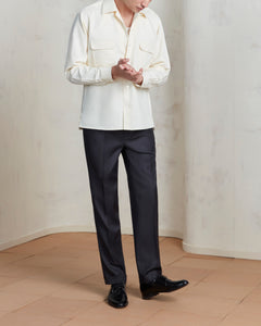พิจารณาอย่างใกล้ชิดจะพบที่มาที่ไปของดีไซน์เชิ้ตรุ่นใหม่นี้ ปกเสื้อและฐานคอมีการเสริมชั้นรองภายในอย่างพอดี ไม่แข็งกระด้าง แค่เพียงพอที่จะให้ปกเสื้อตั้งจั่วได้รูปอยู่ทรง ลาดลงได้องศาเสมอเชิงบ่าเวลาใส่ปลดกระดุมสบายๆ ส่วนฐานคอสูงพอเพื่อรองรับวันที่เนคไทเข้ามาประจำการ ปกเชิ้ตปาดป้านทำมุมกับปกสูทอย่างเหมาะเจาะ หรือบางคราวเข้าสู่โหมดพักร้อนใส่ออกนอกกางเกงก็คงจะถูกใจกับชายเสื้อแบบตัดตรง เผยดีเทลผ่าข้างแบบหางเสื้อเทนนิสให้เคลื่อนไหวสะดวก มีการเย็บล็อคอย่างแน่นหนาเสริมความทนทาน ป้องกันการฉีกขาดตรงรอยแยก กระเป๋าเสื้ออยู่ในตำแหน่งต่ำกว่าปกติเล็กน้อยใช้งานสะดวกมือ ขาดไม่ได้คือกระดุมเปลือกหอยมุกที่สวยงามดูหรูหราอย่างเป็นธรรมชาติ