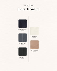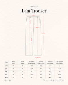 เส้นสายของกางเกงกำหนดทรวดทรงของผู้สวมใส่ ทรวดทรงที่ว่านี้จะต้องให้ทั้งความสมาร์ทและความสบาย การใช้งานที่หลากหลายและต้องลงตัวกับสรีระ จึงเป็นที่มาของ “ลาตา” กางเกงขายาวกึ่งฟอร์มอลที่จะมอบสมดุลแห่งเสื้อผ้าบุรุษแบบคลาสสิคกับแนวคิดการออกแบบที่ก้าวหน้า กางเกงลาตามาในทรงกว้างกว่ากางเกงกึ่งฟอร์มอลรุ่นอื่นๆ ที่เราเคยนำเสนอ แต่ยังรักษามาดสุขุมเช่นเคย เปิดทางเลือกใหม่ในการสวมใส่ เปลี่ยนโครงร่างใหม่ให้ทั้งชุดของคุณด้วยแพทเทิร์นกางเกงที่ออกแบบมาอย่างละเอียดในความร่วมมือกันของเราและช่างตัดเย็บชาวไทยมากประสบการณ์ เอวสูงเกาะกระชับ ขาตรงทรงกว้างได้ที่ ผ้าทิ้งน้ำหนักจรดพื้นได้จังหวะ อยู่ทรงด้วยจีบหน้าเส้นคมที่ทำหน้าที่เป็นดีเทลและเพิ่มพื้นที่ให้ทุกอิริยาบท จับคู่กับเบลเซอร์ในวันที่ต้องการความสุภาพก็ได้ ใส่กับเสื้อยืดและเข็มขัดเส้นเรียวของเราในโอกาสลำลองก็ดี