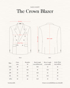 โดดเด่นด้วยไหล่กว้างและทรงสูทที่เข้มแข็งแต่ไม่ทิ้งความรีแล็กซ์ เบลเซอร์กระดุมสองแถวรุ่นใหม่ The Crown Blazer ถูกออกแบบให้ปกสูทอยู่ในตำแหน่งต่ำลง ปกผายกว้างกำลังดีแหลมชี้ทำมุมเฉียงวาดเส้นตรงจากหน้าอกจรดเอว กลัดกระดุมเม็ดล่างสร้างจังหวะการสวมใส่ที่แตกต่าง ส่วนของช่วงตัวกว้างและยาวกว่าเล็กน้อยเมื่อเทียบกับรุ่น The Landmark Blazer ของเรา มีโครงสร้างหางม้าหรือแคนวาสไว้ฟอร์มเข้ากับสรีระของผู้ใส่ เสริมบ่าเล็กน้อย ปกสูทชิ้นบนรูปพระจันทร์เสี้ยวโค้งรับกับหน้าอกและให้สมดุลโดยรวมกับเสื้อนอกตัวนี้ ครบองค์ตรงตามวิถีเทเลอริ่งมาดดีแห่งทศวรรษแปดศูนย์ที่กินความไปถึงกลางยุคเก้าศูนย์ สูทสไตล์นี้เป็นที่นิยมอย่างสูงในหมู่ผู้ทรงอิทธิพลในโลกการเงิน เหล่านักธุรกิจ บรรดาเอ็กเซคคิวทีฟ ไปจนถึงดารานักแสดงและบุคคลมีชื่อเสียงในยุคนั้น จนกลายเป็นภาพจำให้กับเราในยุคนี้